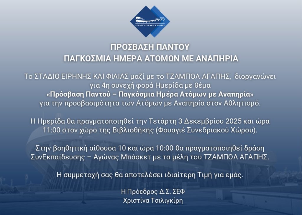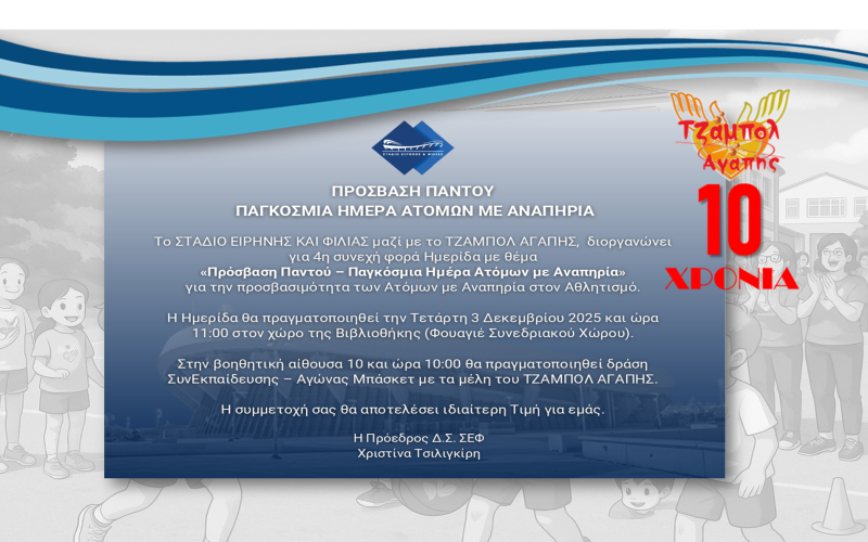 Το Στάδιο Ειρήνης και Φιλίας, σε συνεργασία με το ΤΖΑΜΠΟΛ ΑΓΑΠΗΣ, διοργανώνει για 4η συνεχόμενη χρονιά την Ημερίδα με τίτλο: