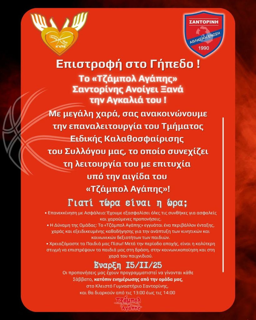 Στη Σαντορίνη, ένα νησί που είναι παγκοσμίως γνωστό για το φως, τα χρώματα και τη μοναδική του ενέργεια, χτίζεται αθόρυβα αλλά σταθερά κάτι εξίσου φωτεινό: μια κοινότητα αγάπης, αποδοχής και ουσιαστικής συμπερίληψης μέσα από το μπάσκετ. Το «ΤΖΑΜΠΟΛ ΑΓΑΠΗΣ ΣΑΝΤΟΡΙΝΗΣ» δεν αποτελεί απλώς ένα αθλητικό πρόγραμμα. Είναι μια ζωντανή, ανθρώπινη υπόσχεση ότι κάθε παιδί μπορεί να ανήκει, να εξελίσσεται, να χαίρεται το παιχνίδι και να νιώθει υπερήφανο για τον εαυτό του.