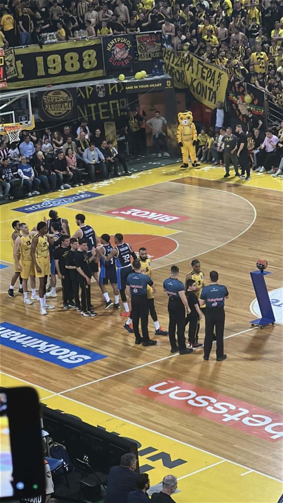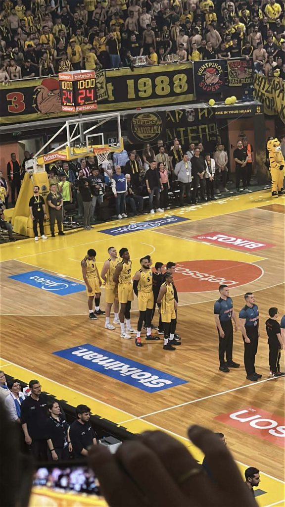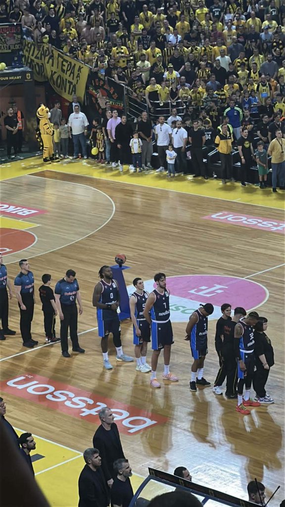 Μπροστά σε ένα κατάμεστο γήπεδο, με την παρουσία του ιδιοκτήτη της ΚΑΕ ΑΡΗΣ Richard Hsiao, του θρύλου του ελληνικού μπάσκετ Νίκου Γκάλη και των αδελφών Γιάννη και Θανάση Αντετοκούνμπο, τα παιδιά μας στάθηκαν με υπερηφάνεια δίπλα στους παίκτες των δύο ομάδων και στους διαιτητές, κατά την ανάκρουση του Εθνικού Ύμνου της Ελλάδας.
